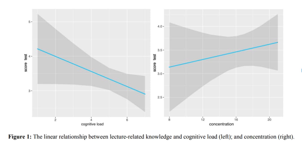 When researchers compared students’ knowledge from the lecture and self-reported measures of concentration, cognitive load, and interaction difficulty they found that cognitive load is negatively related to the task score whereas concentration positively :