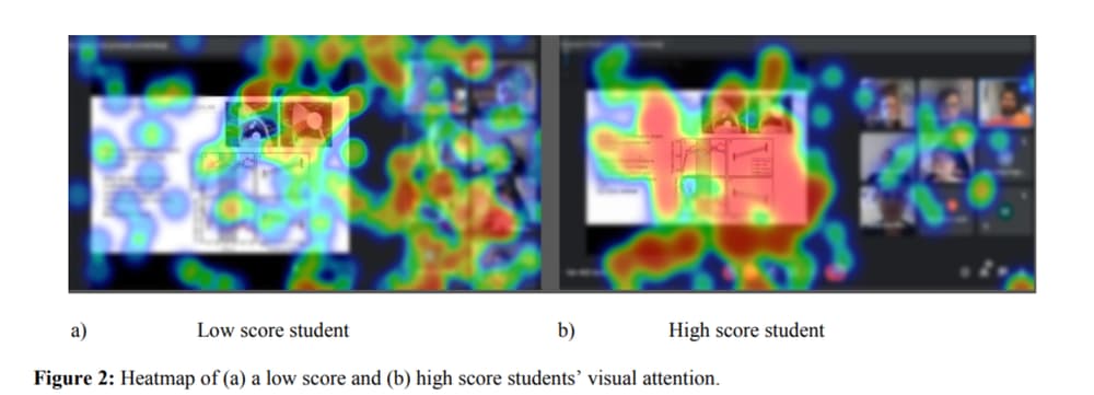 Next, they discovered the difference in the distribution of visual attention on different AOI between students with low and high scores. The high score group spent significantly more time looking at the teacher and significantly less time at themselves, and other students.