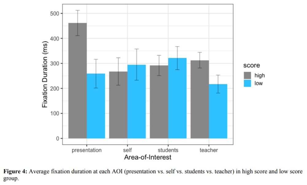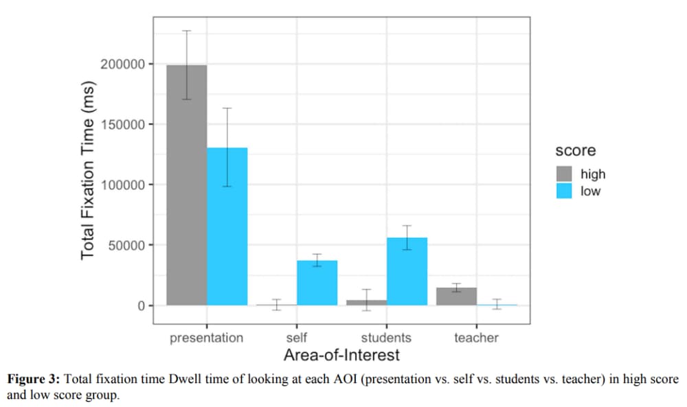 Next, they discovered the difference in the distribution of visual attention on different AOI between students with low and high scores. The high score group spent significantly more time looking at the teacher and significantly less time at themselves, and other students.