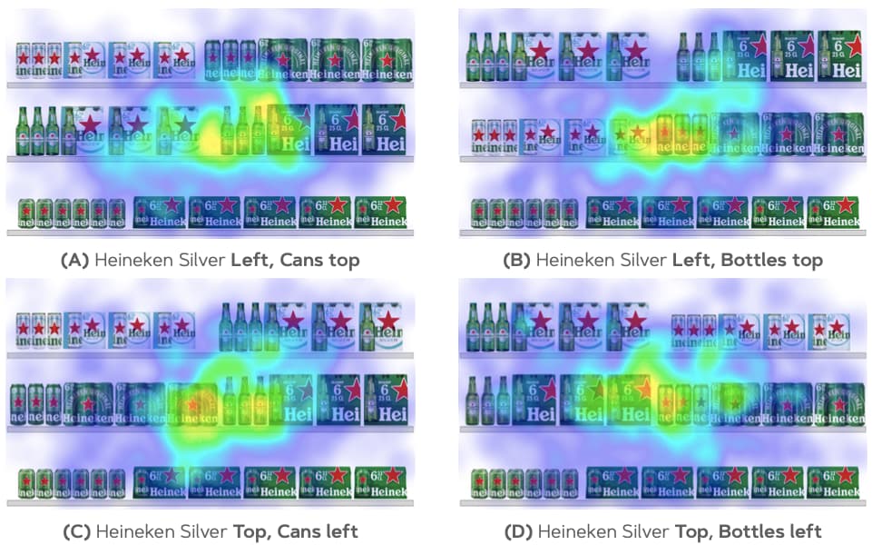 The results were interesting, Heineken Silver attracted the most attention when positioned on the left of Heineken Lager compared to the positioning at the top of the shelf. Those results give a clear answer to a question that would have taken a long time to discuss without research.