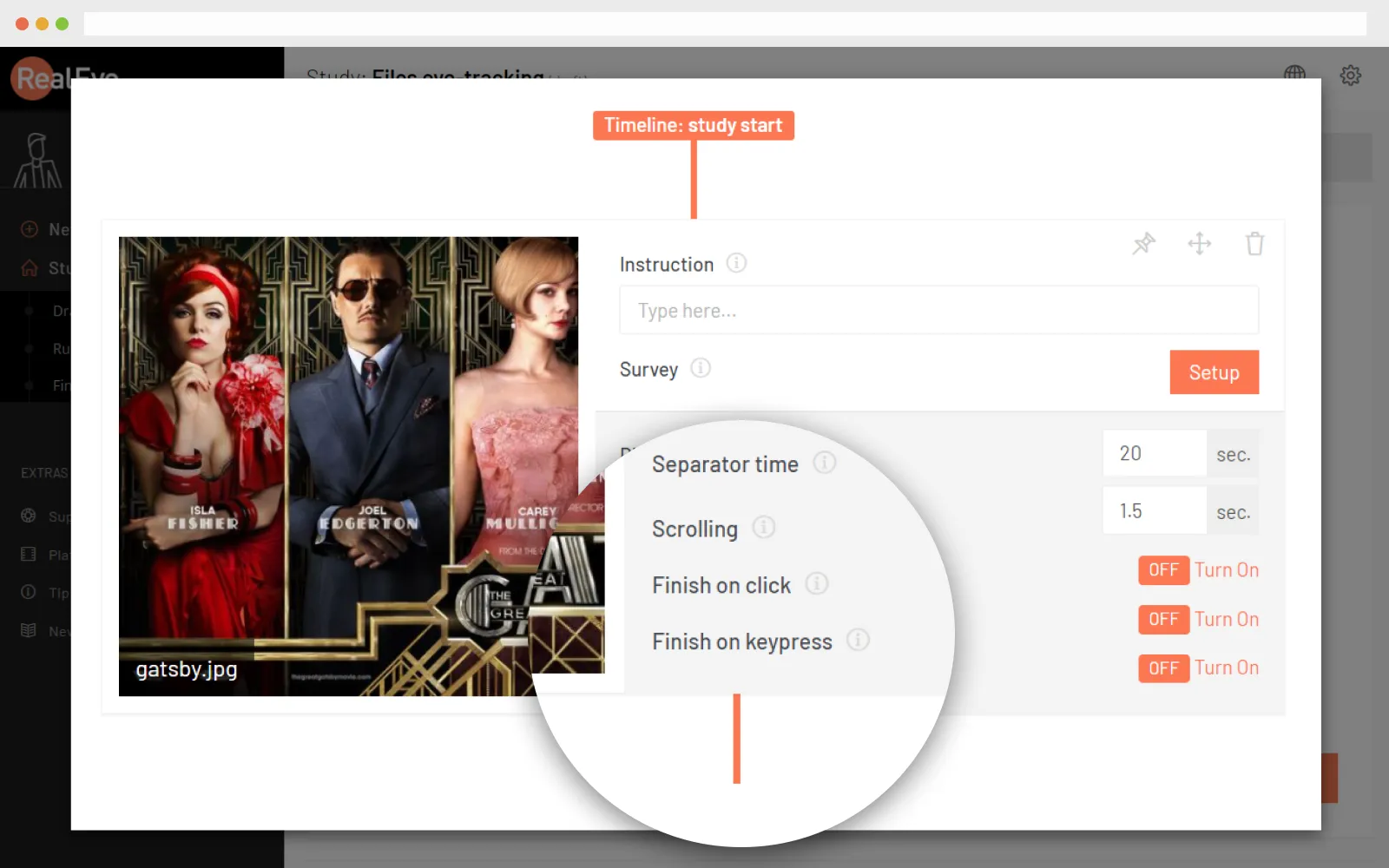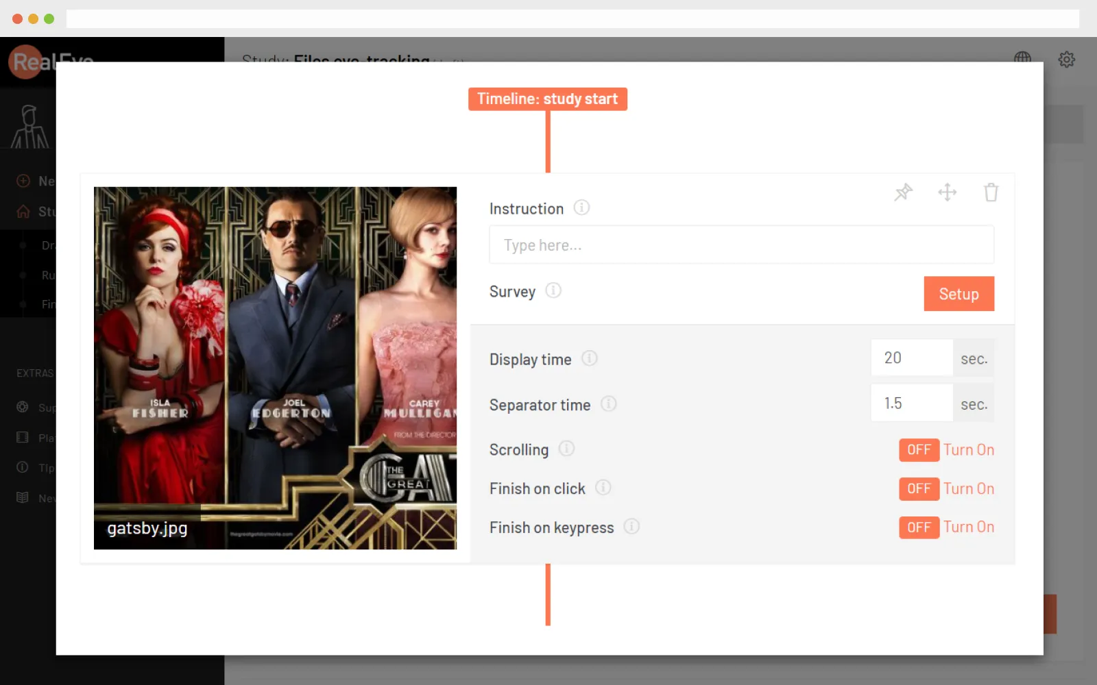 RealEye Dashboard is designed to be intuitive and useful at the same time. It is divided into three main sections, which are crucial while running any research: setting up the study, fielding study with the data, and last but not least, data analysis. A study can be reverted to any of these states to make some adjustments at any time.